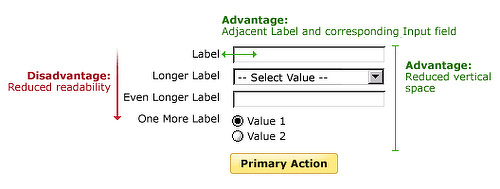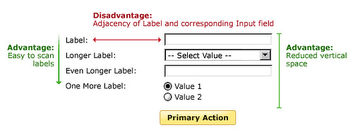 - Processing the labels and input fields requires little cognitive effort because they’re so close together (average of 50ms to move from label to input, vs. 500ms for left-aligned labels and 240ms for right-aligned)